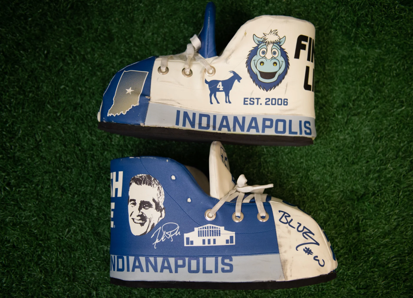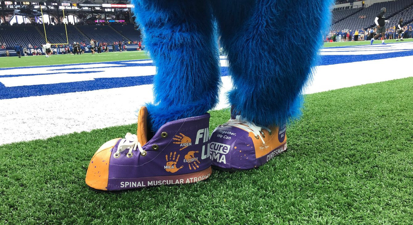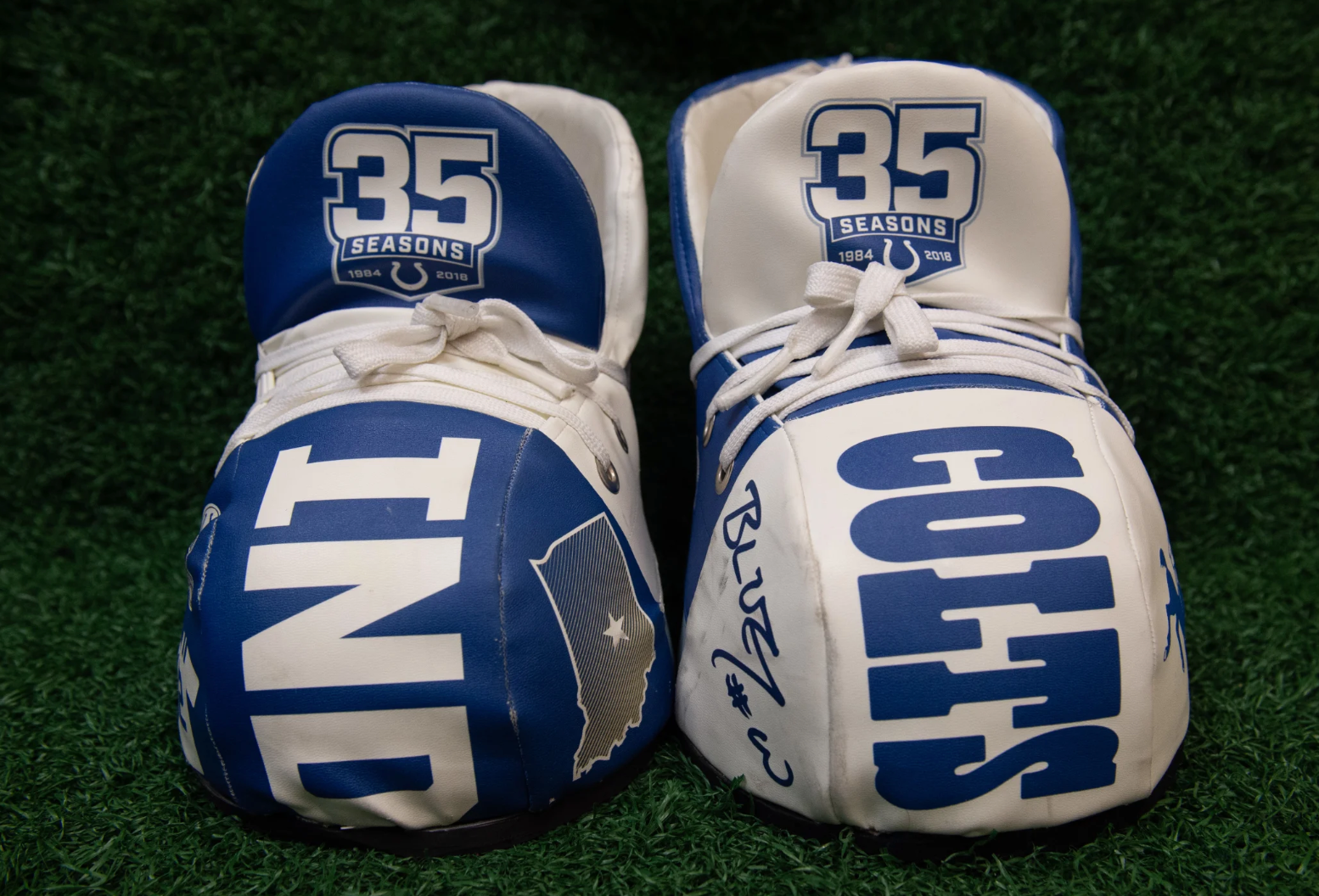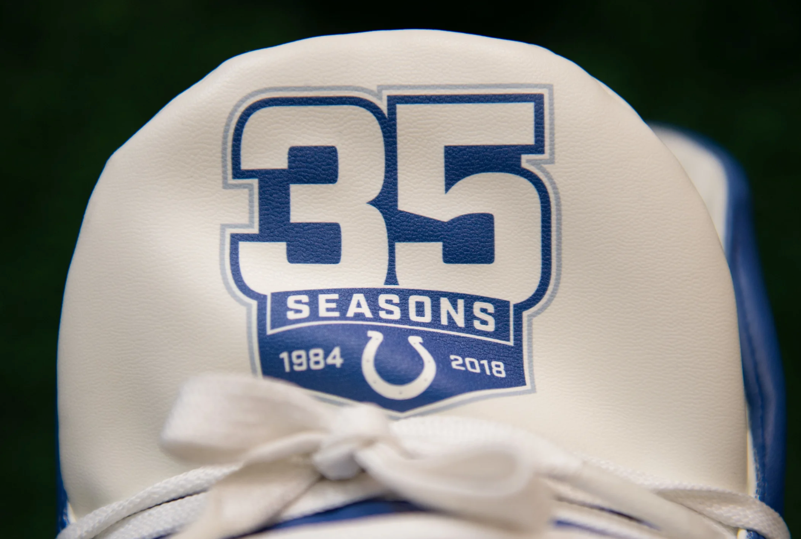 Indianapolis Colts mascot Blue wanted a different pair of “kicks” for each month of the 2018 season to highlight causes and organizations him and his team wanted to raise awareness for. These are the cleats for the first three months: July - Special Olympics Indiana, August - Cure SMA, and September - Colts 35th Season Celebration and the Heart Behind the Horseshoe. Worked closely with the shoe designer for templates and the printer for materials and quality control.