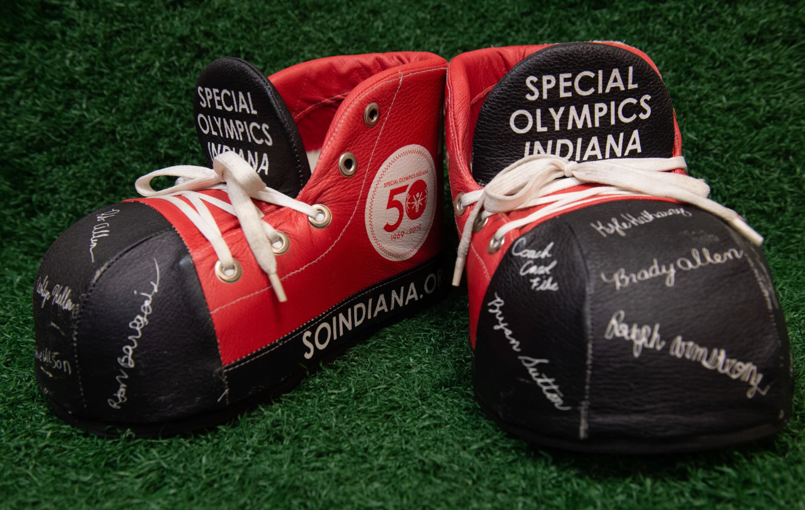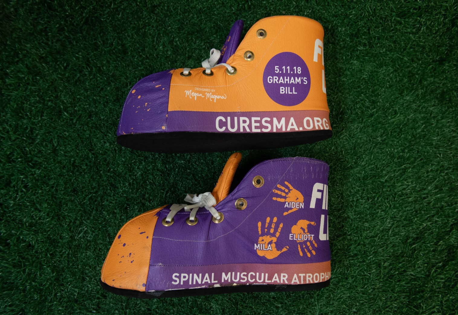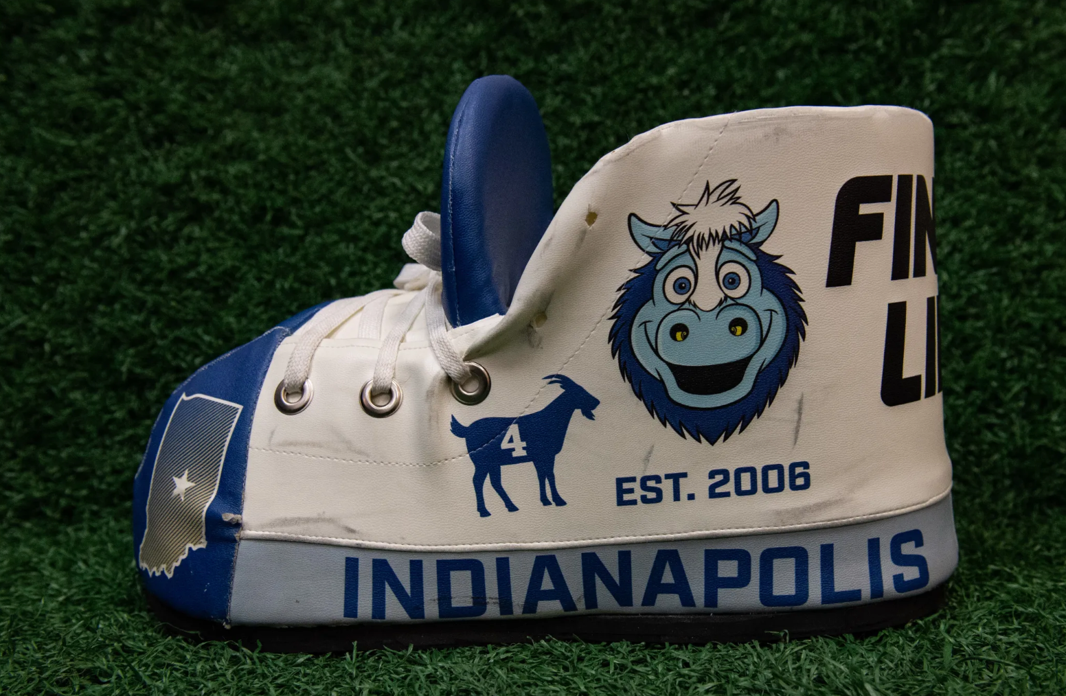 Indianapolis Colts mascot Blue wanted a different pair of “kicks” for each month of the 2018 season to highlight causes and organizations him and his team wanted to raise awareness for. These are the cleats for the first three months: July - Special Olympics Indiana, August - Cure SMA, and September - Colts 35th Season Celebration and the Heart Behind the Horseshoe. Worked closely with the shoe designer for templates and the printer for materials and quality control.